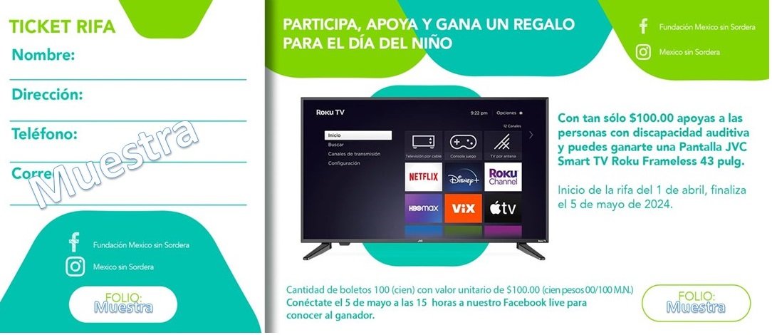 Este día del niño la Fundación México sin sordera, A.C. rifara una televisión. Te invitamos a participar en esta recaudación para que nuestros niños y niñas puedan seguir escuchando.