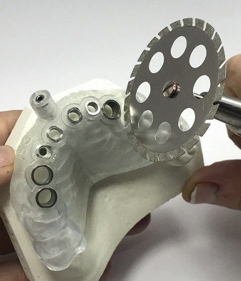 El Sistema para Guías Quirúrgicas está diseñado con discos de diamante para el acetato, así como fresones y fresas de carburo de tungsteno, con fresón blanco de cerámica para un alisado perfecto del acetato y son: